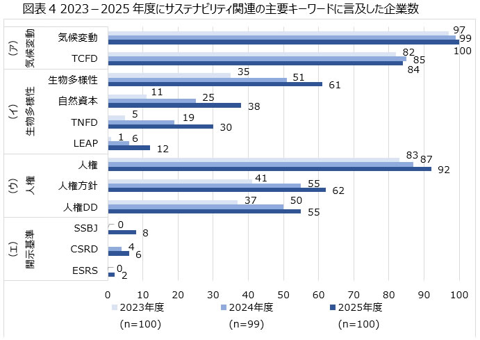 」(2025年10月31日参照)(※7)「気候変動」には、気候変動、TCFD、「生物多様性」には、生物多様性、自然資本、TNFD、LEAP、「人権」には、人権、人権方針、人権デュー・ディリジェンス、「開示基準」には、TCFD、TNFD、SSBJ、CSRD、ESRSを割り当てて整理している。各主要キーワードの有価証券報告書における言及の有無を確認しており、開示基準について実際に準拠しているかどうかは区別していない。