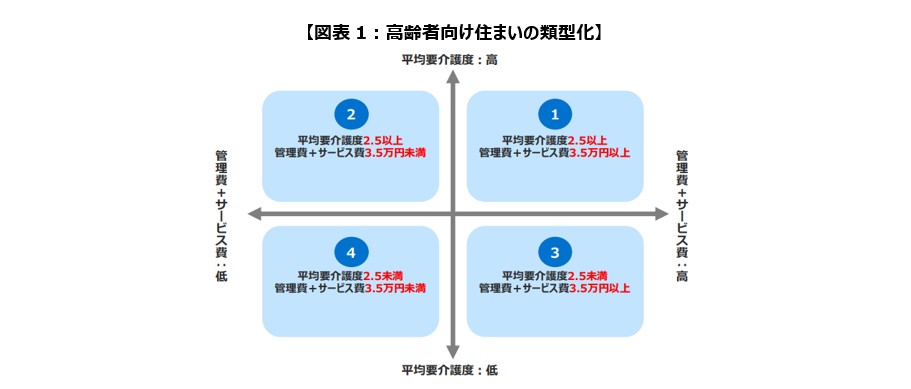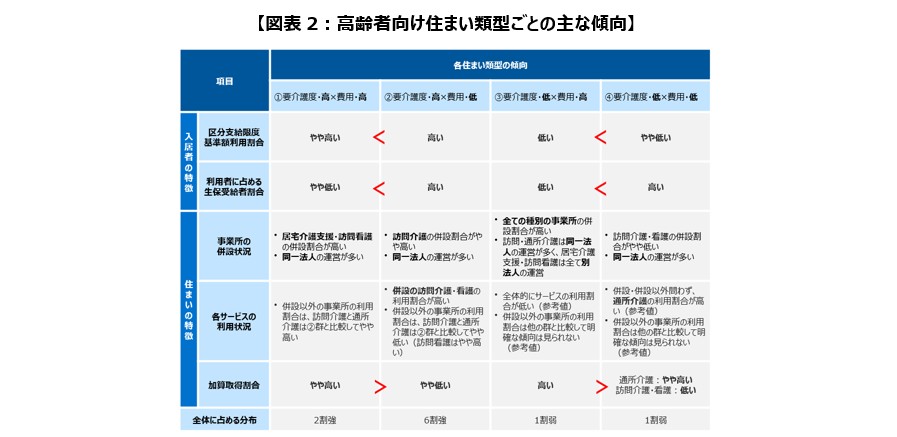 高齢者向け住まいの類型化は<管理費・サービス費×入居者の平均要介護度>の観点で行い、4群に整理した(図表1)。各類型の入居者の状況や利用サービス等(入居者の区分支給限度額利用割合、生活保護受給者の入居状況、サービス利用状況、併設する介護保険サービス提供事業者等)の分析結果は以下の通りである(図表2)。