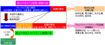 したがって、具体的には、学内の反発が予想される人的資源に対するリストラクチャリング等を目的とするのではなく、業務体系等をスリム化することで生まれる余力を、企画・政策立案業務や教員・学生支援等新しいソフト面でのサービス業務に振り向ける組織革新を目指すこととなる。だからこそ「業務再設計」あるいは「業務の構造改革」によって、仕事の仕組見直し、合わせて必要な人員とそのスキルを設定する戦略が必要となる。