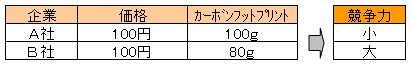 後者の場合、対策の実施コストがA社の商品価格のアップとして反映されると予想されます。このとき、相対的にみて価格は高いがカーボンフットプリントが低いA社と、価格は安いがカーボンフットプリントが高いB社のどちらの商品が売れるのでしょうか。