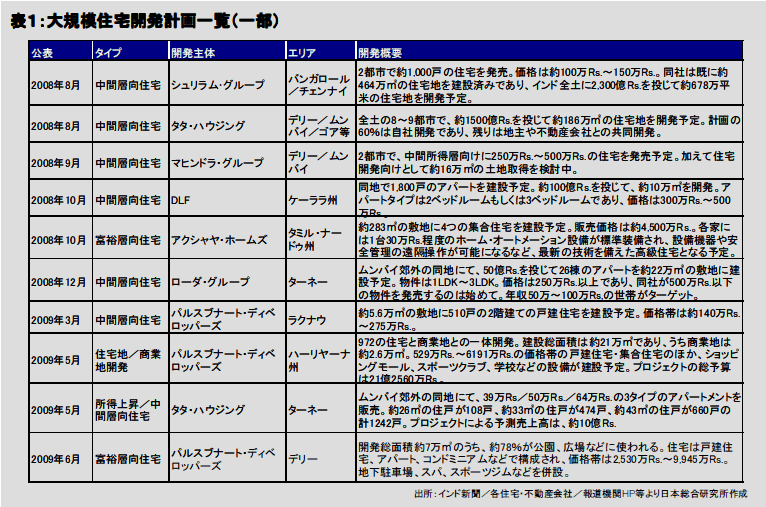 公的な住宅投資が主として低所得者向けの住宅建設に向けられることに対して、民間企業は富裕層向けの住宅建設に注力してきた。ムンバイ・デリー・バンガロールの人口上位3都市では、現在30以上の富裕層向け「ゲイテッド・コミュニティ」の開発が進行中である。この住宅建設の2極化の傾向と中間所得層の拡大により、都市部での需給ギャップの拡大が深刻化している。今まさに、住宅を必要とする層に向けた適切な価格での住宅供給が求められているのである。
