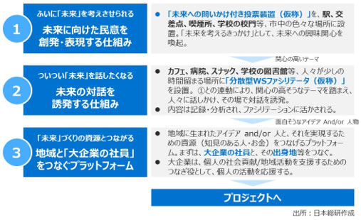 上記を踏まえ、学校法人武蔵野美術大学と日本総研は、「自律協生社会の実現に向けた共同研究」の一環として、未来創発・未来対話をコアとした市民エンパワーメントのデザインをテーマとした共同プロジェクトを推進しています。本プロジェクトでは、少子高齢化を見据え、市民の活動量を高める(エンパワーメントする)ことを目的とし、そのための効果的・効率的な仕組み・仕掛けの確立を目指します。具体的には、3つのモジュールを対象に、実践と研究を早いサイクルで繰り返すアクションリサーチにて推進していきます。