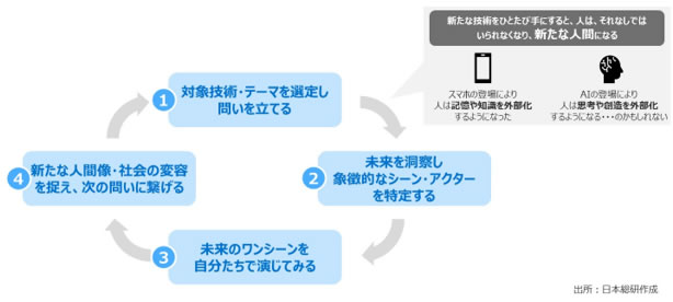 未来デザイン・ラボは、メッシュワークとの協働により、人類学のフィールドワークやエスノグラフィー手法を用いて人々の生活世界を深く探ります。そこから得られる文化的インサイトを、未来洞察の「兆し」スキャニングやシナリオプランニングに組み込み、定性的・定量的な両面から未来像を描きます。このプロセスにより、従来の戦略立案では見過ごされがちな新しい価値創造の機会を発見します。